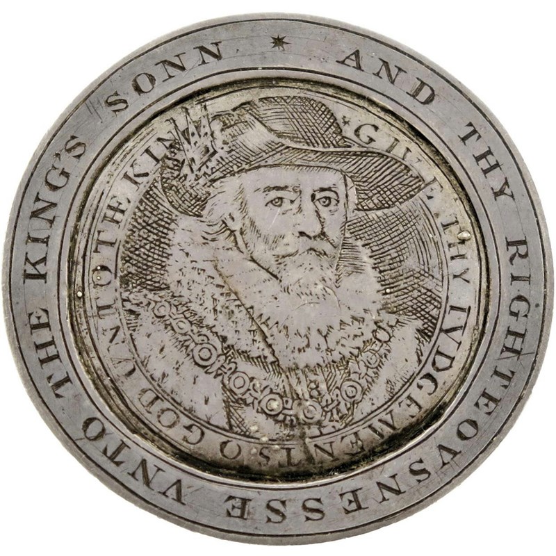 James I (and Charles, Prince of Wales), engraved silver counter, workshops of Simon or Willem de Passe, c.1616, bust of James three-quarters right, wearing broad-brimmed hat with jewel, lace ruff, ermine robes and Collar of the Garter, GIVE THY IUDGEMENTS O GOD UNTO THE KING, set in a wide border, engraved in matching lettering with the legend found on the counter's reverse, AND THY RIGHTEOVSNESS UNTO THE KINGS SONN, 36mm., (MI 376/272, for counter). Obverse extremely fine and the only example known to the cataloguers with this added border.