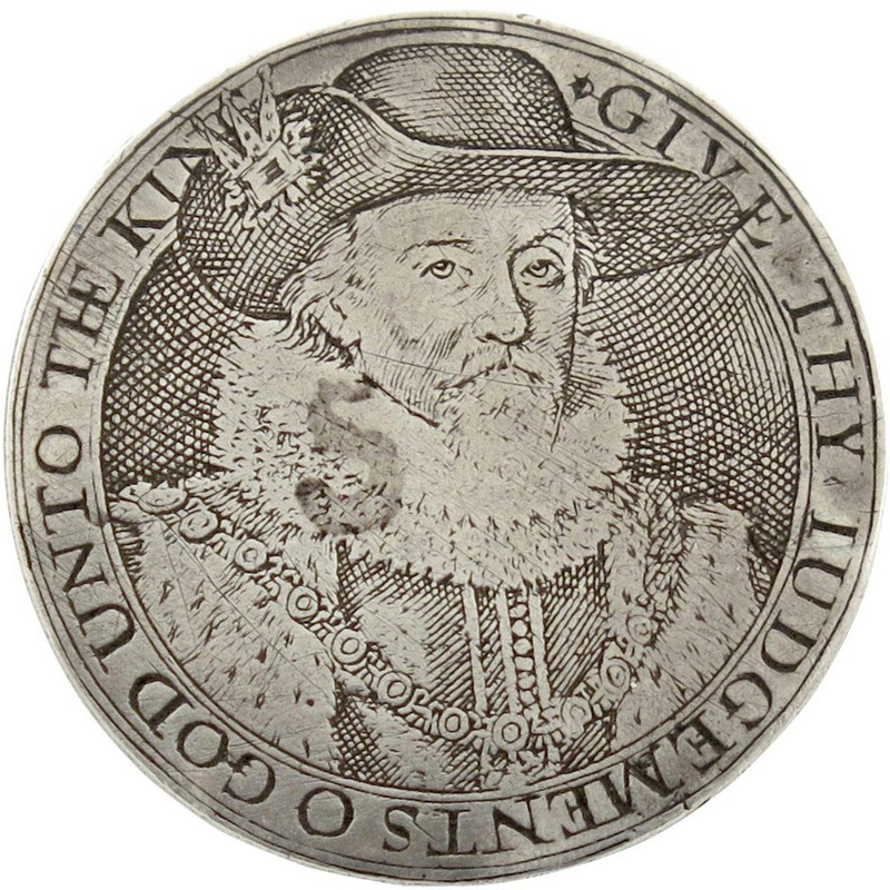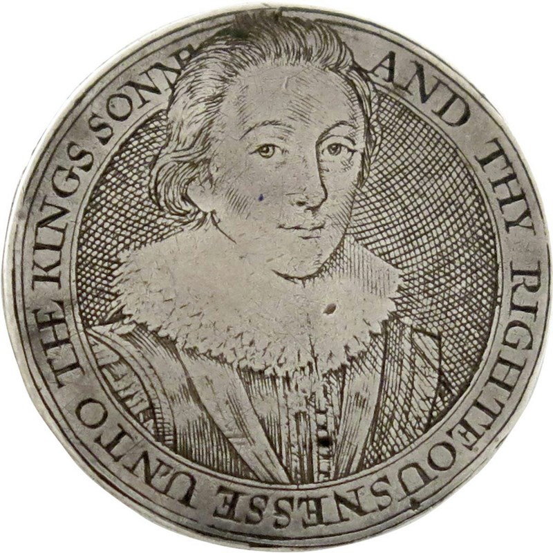 James I and Charles, Prince of Wales, engraved silver counter, workshop of Simon de Passe, c.1616, bust of James three-quarters right, wearing broad-brimmed hat with jewel, lace ruff, ermine robes and Collar of the Garter, GIVE THY IUDGEMENTS O GOD UNTO THE KING, rev., bust of Prince Charles, small pointed beard and lace collar over doublet, AND THY RIGHTEOVSNESSE UNTO THE KINGS SONN, 30mm (MI 376/272, var.). Good very fine.