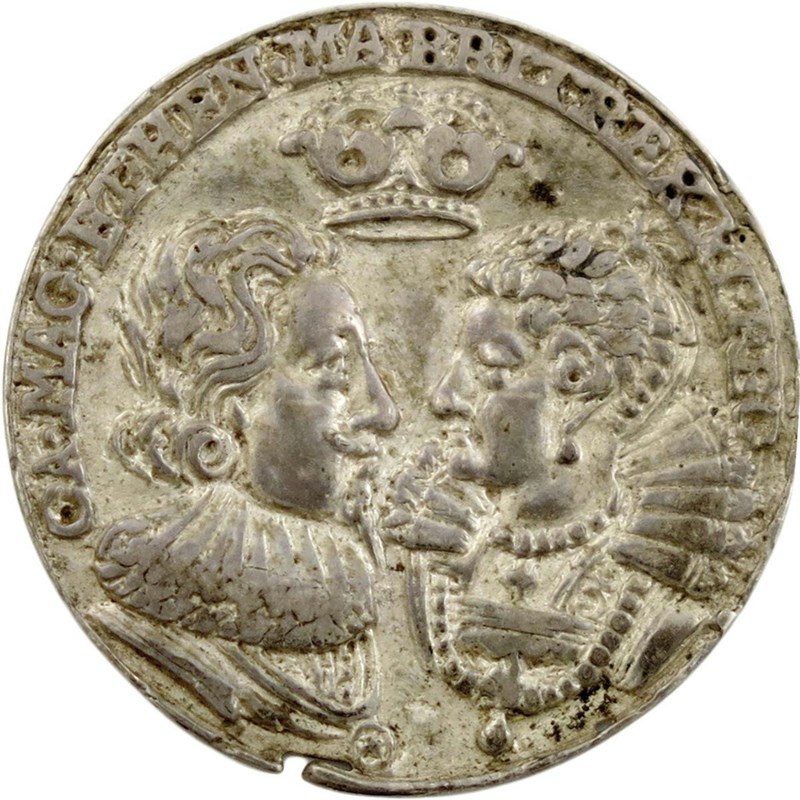 Charles I, Marriage to Henrietta Maria (1609-1669), cast silver medallet, 1625, by Pierre Regnier, busts vis-à-vis, he wearing falling lace ruff, CA MAG …, rev., cupid scattering roses and lilies, FVNDIT AMOR LILIA MIXTA ROSIS, 21mm (MI 239/3; Eim.105; BMC [Jones]105; Platt I, type B, pp. 115-16). Very fine and the rare variety.