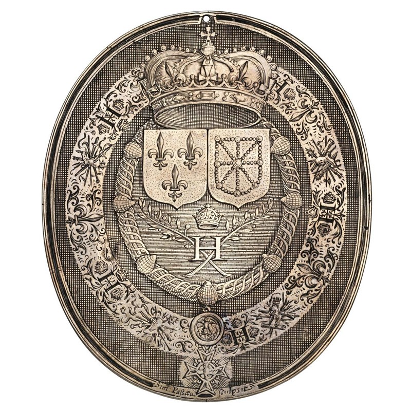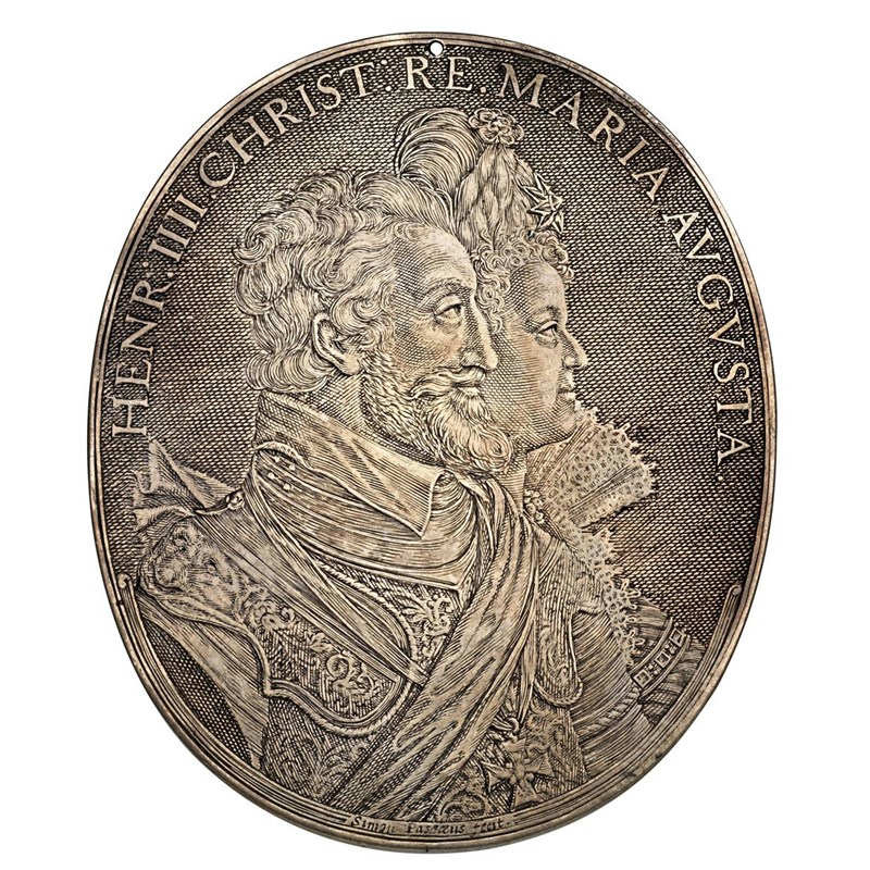 Henri IV (1553-1589-1610) and Marie de Médicis (1573-1642), King and Queen of France, oval silver portrait medal, by Simon de Passe, unsigned, circa 1625, in imitation of engraving, conjoined busts to right, he in decorated armour, a sash from his left shoulder and, on a ribbon, the Badge of the Order of the St. Esprit, she with decorative high lace collar and jewelled star in her hair, signed below, "Simon Passæus fecit", HENR IIII CHRIST RE MARIA AVGVSTA, rev., crowned oval with the shields of France and Navarre and crowned H and olive branches, within the Collars of the Orders of St. Michael and the St. Esprit, signed below, "Sim: Passæus sculpsit", 66 x 55mm (MI 240/7). A superb medal, extremely fine and extremely rare.