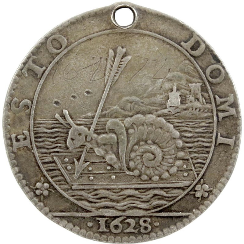 Charles I, the attack on the Île de Ré [Isle of Rhé], French silver satirical medal, 1628, unsigned, crowned arms of France within the collars of two Orders, NIL NISI CONSILIO, rev., the English snail, an arrow through its neck, on a raft, the island and fort beyond, ESTO DOMI, 26mm (MI 248/21). Very fine, though pierced at top, some light graffiti numerals by arrow, scarce.
