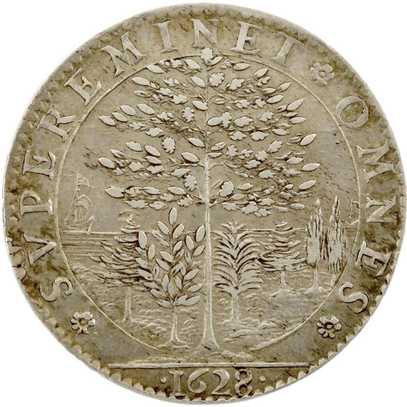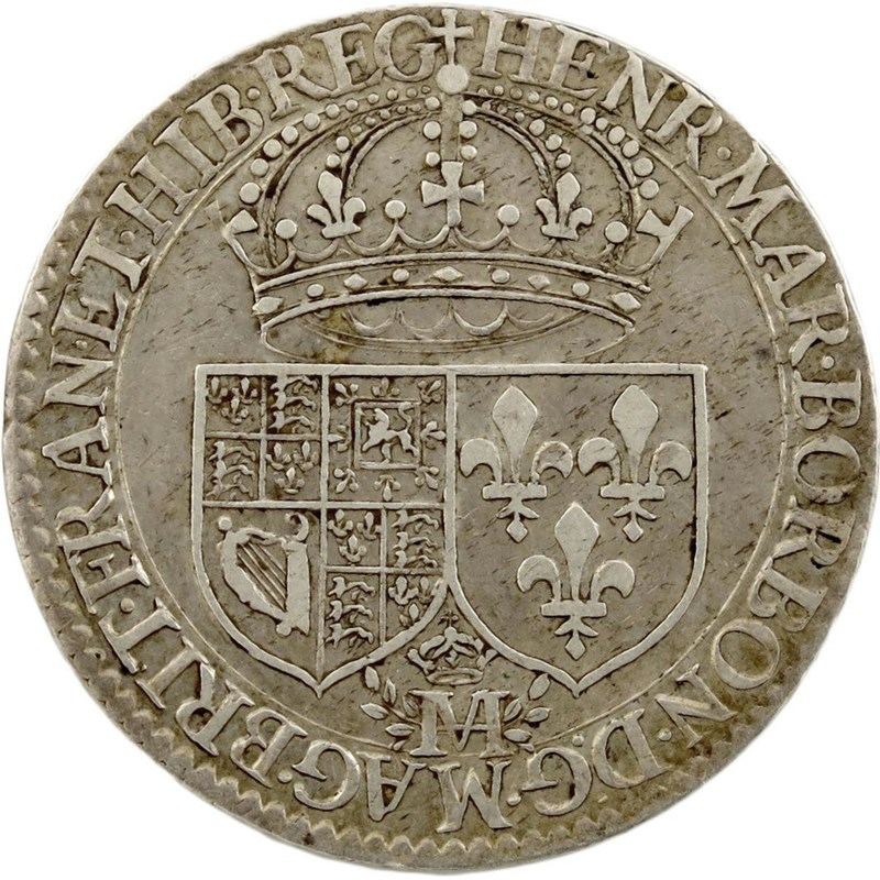 Charles I, tribute to Queen Henrietta Maria, silver medal, 1628, by Nicolas Briot, crown over the two shields of England and France, HEN MAR BORBON DG MAG BRIT FRAN ET HIB REG, rev., a grove where one tree dominates the rest, ships at sea beyond, SVPEREMINET OMNES - 1628, 28mm (MI 249/23; Eim 110; BMC [Jones] 129; Platt, type A, p.119). Very fine.