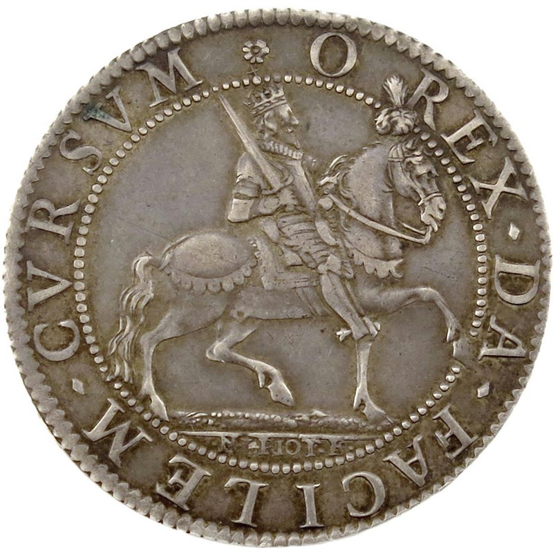 Charles I, the expedition to La Rochelle, silver medal or Pattern Halfcrown, 1628, by Nicolas Briot, equestrian portrait to right, with sword drawn, O REX DA FACILEM CVRSVM, rev., crowned oval and garnished shield dividing date, ATQVE AVDACIBVS ANNVE COEPTIS, plain edge, 35mm; 14.69g (MI 252/32; BMC [Jones] 136; Brooker 1258, same dies; North 2673; Bull 467). Nearly extremely fine, toned and extremely rare.