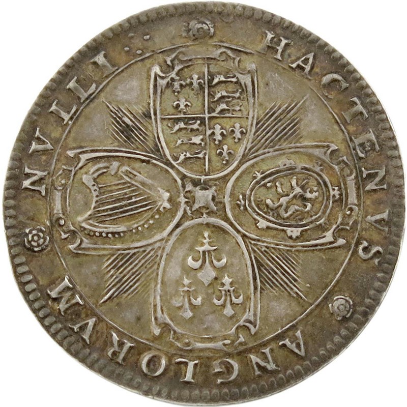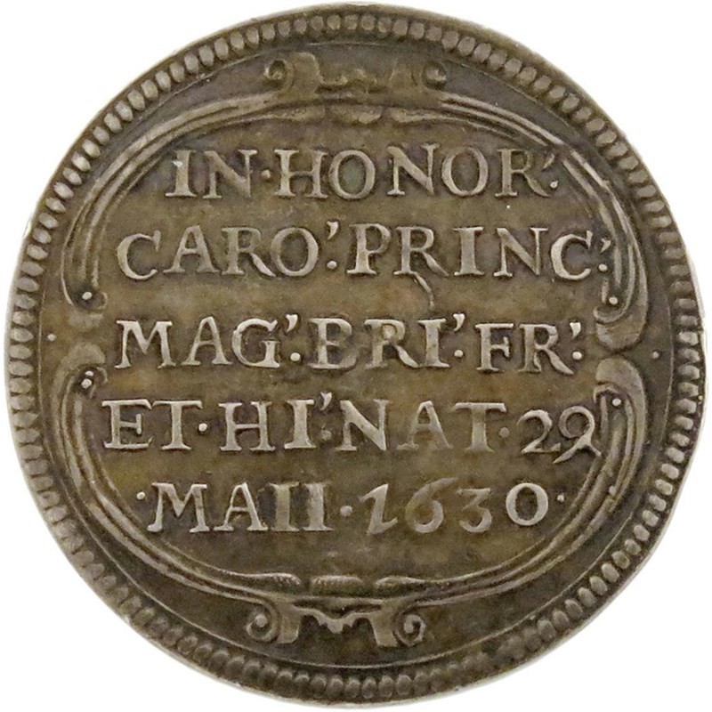 Charles I, birth of Prince Charles, smaller silver medal, 1630, attributed to Nicolas Briot, cruciform arms of England and France, Scotland, France, and Ireland over radiant star, HACTENVS ANGLORVM NVLLI, rev., legend in five lines, within cartouche, IN HONOR CARO PRINC MAG BR FRA ET HI NAT 29 MAII 1630, 24mm (MI 254/35; Eim. 116; Platt p. 128). Nearly extremely fine and toned.