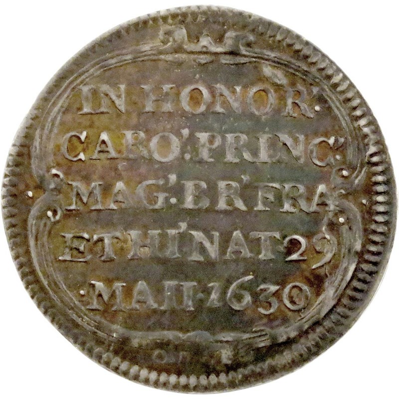Charles I, birth of Prince Charles, silver medal, 1630, attributed to Nicolas Briot, cruciform arms of England and France, Scotland, France, and Ireland over radiant star, HACTENVS ANGLORVM NVLLI, rev., legend in five lines, within cartouche, HONOR PRIN MAG BRIT FRA ET HIB NAT 29 MAI ANN 1630, 30.5mm (MI 254/35; Eim. 116; Platt p. 128). Nearly extremely fine and toned.