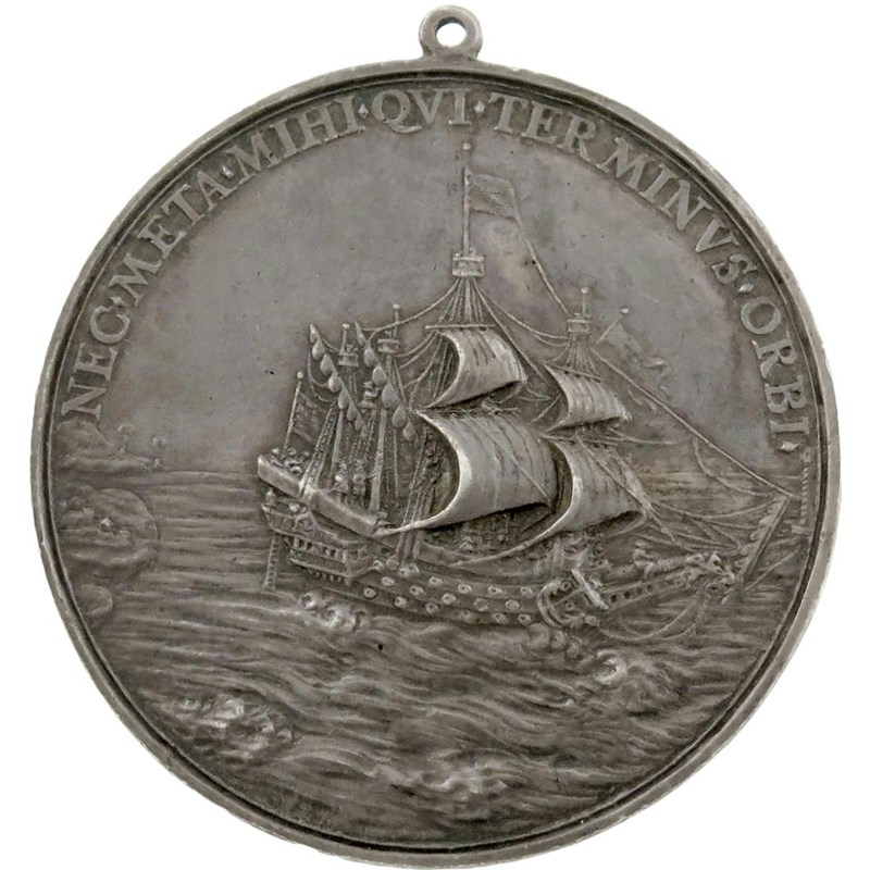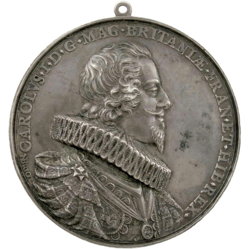 Charles I, the Dominion of the Sea, cast silver medal, undated [1630], by Nicolas Briot, bust of the King right, wearing ruff, cloak ornamented with the royal ciphers CC and CH, Garter George suspended from ribbon, signed behind shoulder N BRIOT, CAROLVS I DG MAG BRITANIÆ FRAN ET HIB REX, rev., ship sailing right, NEC META MIHI QVI TERMINVS ORBE, 61mm (MI 256/40; BHM [Jones] 144-46; Eim. 118; vL II 227; MH 25; Farquhar I, 203; Platt, pp. 123-25), small contemporary suspension loop. A choice example of this wonderful portrait medal, extremely fine, toned and rare.