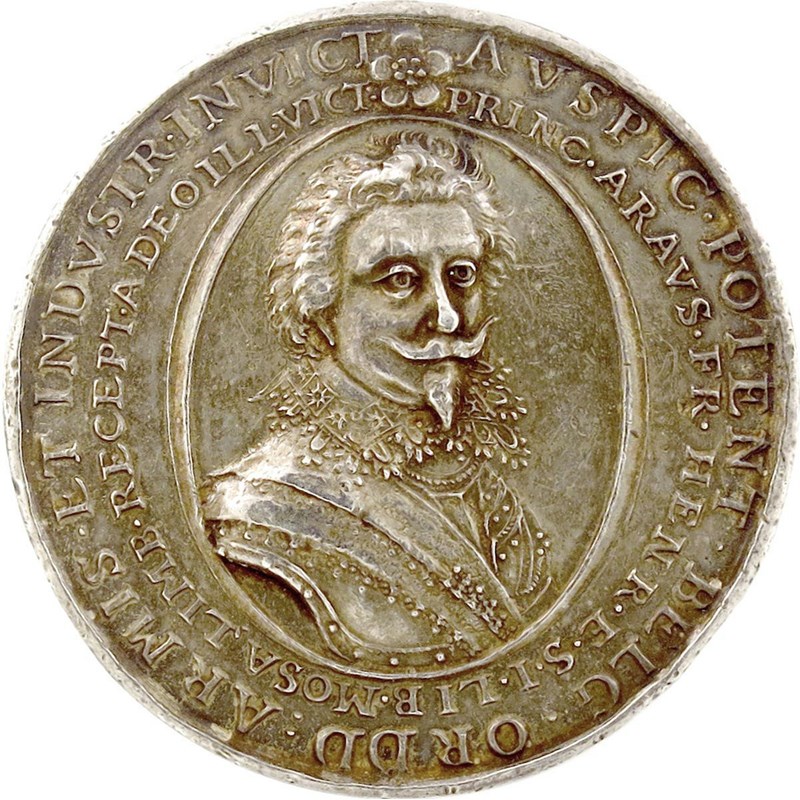 Frederick Henry (1584-1647), Prince of Orange and Stadtholder, the siege of Maastricht and re-capture of Limbourg, silver medal, by Aert Verbeeck the Younger, 1632, armoured bust with lace collar three-quarters right, within oval, legend around in two lines, rev., cartographical plan of the city and fortifications of Maastricht, below panorama of Pappenheim's army crossing the Maas, TRAIECT AD MOSA RECEPT 1632, 56.5mm (MI 263/56; Eim 122; vL II, 202; Scher [1997] 14). Good very fine and toned.