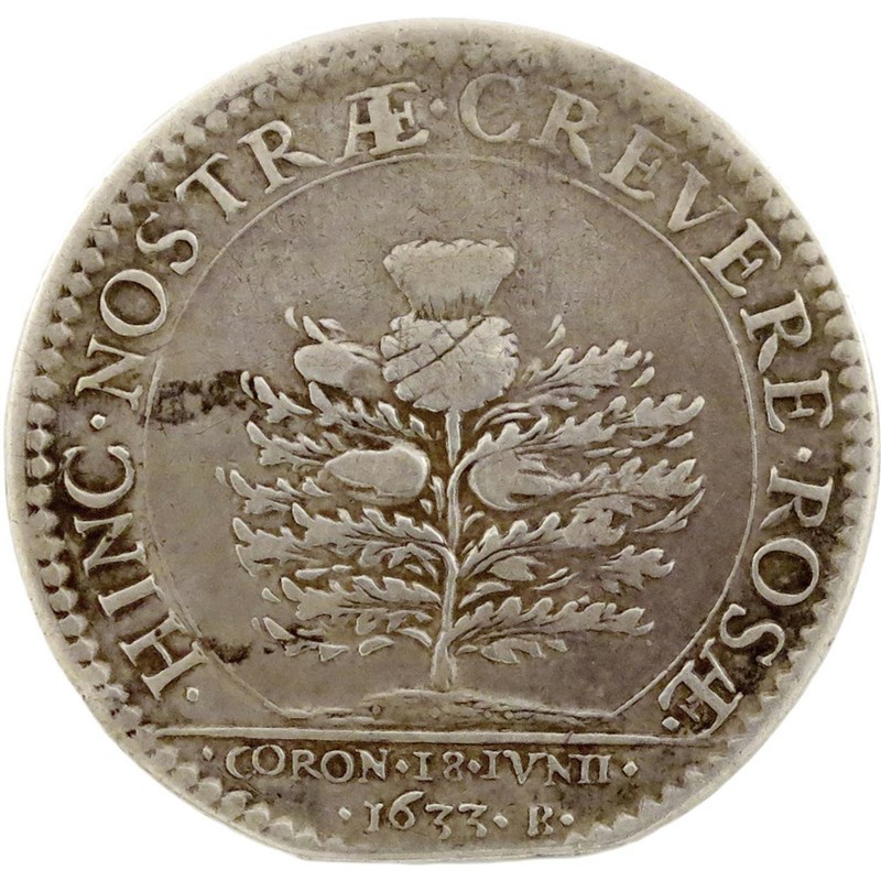 Charles I, the Scottish Coronation, silver medal, 1633, by Nicolas Briot, signed B on rev., crowned and draped bust left, wearing ornate lace collar, CAROLVS DG SCOTIÆ ANGLIÆ FR ET HIB REX, rev., a Scottish thistle in flower, HINC NOSTRÆ CREVERE ROSÆ, 30mm; 9.9g (MI 266/60; Eim. 123; BMC [Jones] 155; Platt p. 133, type B; H & P pL 27, 9; Woll iii). Nearly very fine.