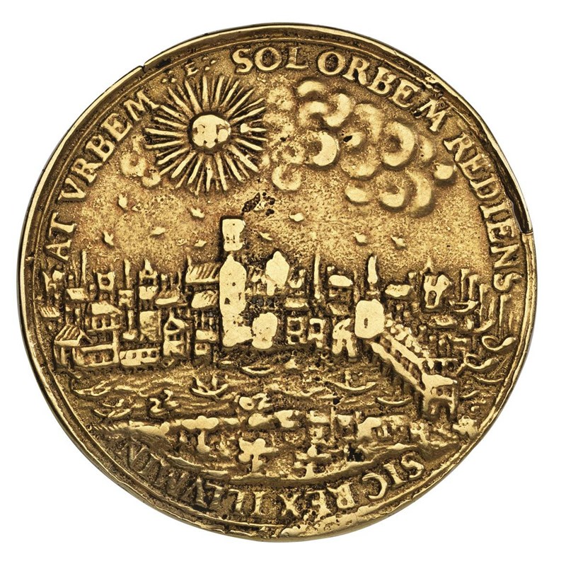 Charles I, the return to London, cast gold medal, 1633, by Nicolas Briot, king on horseback left, holding sceptre in right hand, Eye of Providence above, plumed helmet on flowery ground below, CAROLVA AVGVSTISS ET INVICTISS MAG BRIT FRAN ET HIB MONARCHA - 1633, rev., a panoramic view of the city of London, with St Paul's and old London Bridge, SOL ORBEM RADIANS SIC REX ILLVMINAT URBEM, view of the city of London, sun above, a small E to the left of the sun, 42.5mm (MI 266/62; Eim.124; CP.20/4; BMC [Jones] 158a; Platt p. 135, type B, this specimen illustrated). Very fine, small scratch above shoulder, extremely rare.