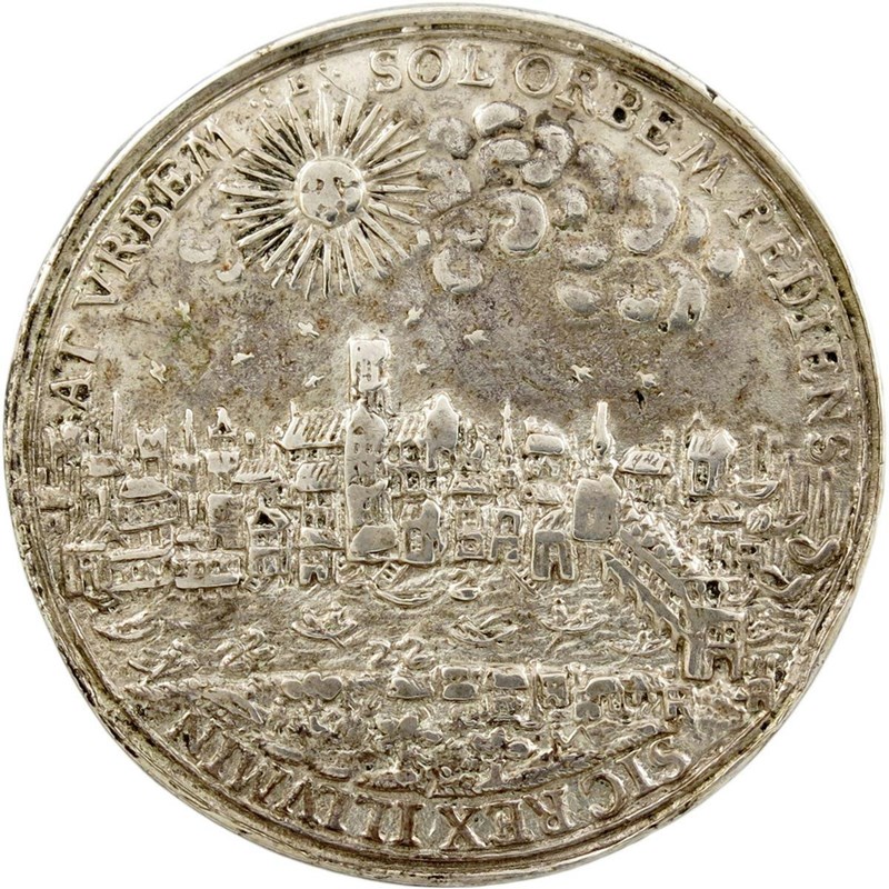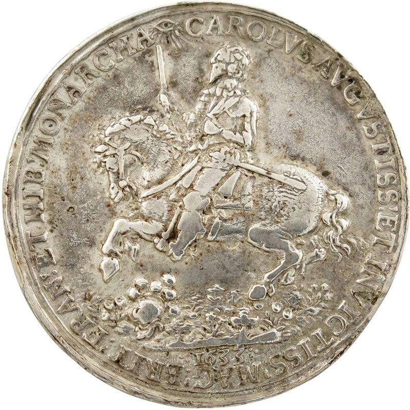 Charles I, the return to London, cast silver medal, 1633, by Nicolas Briot, king on horseback left, holding sceptre in right hand, Eye of Providence above, plumed helmet on flowery ground below, CAROLVA AVGVSTISS ET INVICTISS MAG BRIT FRAN ET HIB MONARCHA - 1633, rev., a panoramic view of the city of London, with St Paul's and old London Bridge, sun above, a small E to its left,,SOL ORBEM RADIANS SIC REX ILLVMINAT URBEM, 42mm (MI 266/62; Eim.124; CP.20/4; BMC [Jones] 158a; Platt p. 135, type B). Very fine with some tooling.
