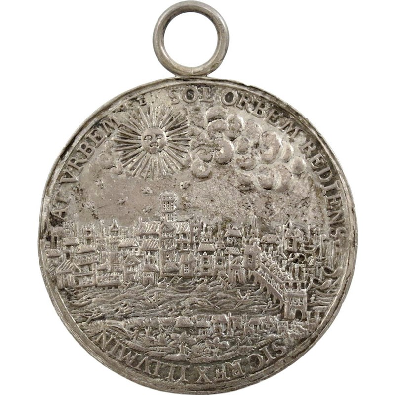 Charles I, the return to London, cast silver medal, 1633, by Nicolas Briot, bust of the King right, hair long, wearing falling lace collar and Garter George on ribbon, legend in band around with slightly stippled background, CAR DG MAG BRITAN FRAN ET HIB REX, rev., a panoramic view of the city of London, with St Paul's and old London Bridge, sun above, a small E to its left, SOL ORBEM RADIANS SIC REX ILLVMINAT URBEM, 41.5mm (MI 266/63; Eim.125; CP.20/5; BMC [Jones] 159; Farquhar I, 182; Platt p. 137, type C), suspension loop. A cast of superb quality and sharpness, some light tooling, extremely fine and very rare.