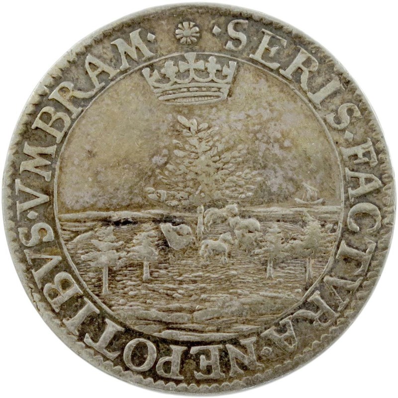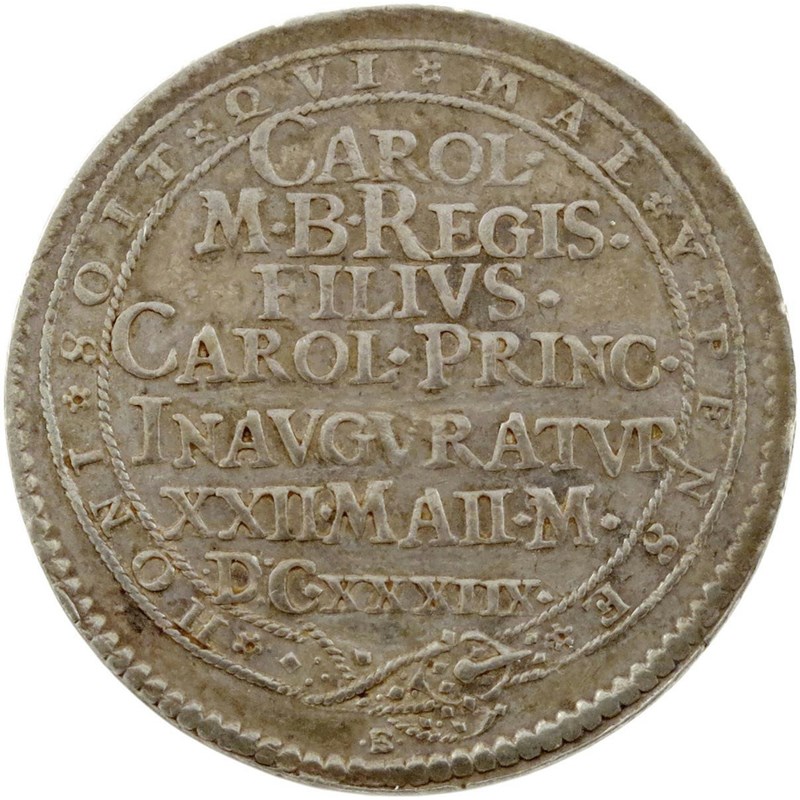 Prince Charles, Installation as a Knight of the Garter, silver medal, 1638, by Nicholas Briot, sheep shelter beneath the tallest tree, above which his coronet, SERIS FACTVRA NEPOTIBVS VMBRAM, rev., legend in seven lines within Garter, CAROL M B REGIS FILIVS CAROL PRINC INAVGVRATVR XXII MAI MDCXXXIIX, 30mm (MI 281/88; Eim. 131; BMC [Jones] 171; Platt, type B, pp. 144-45). Very fine.