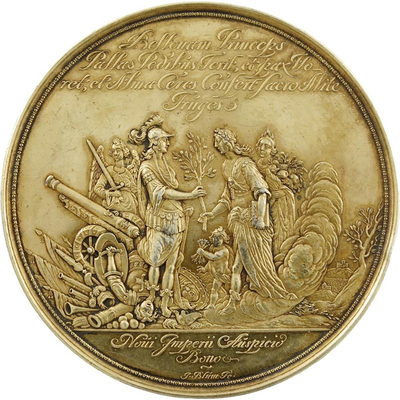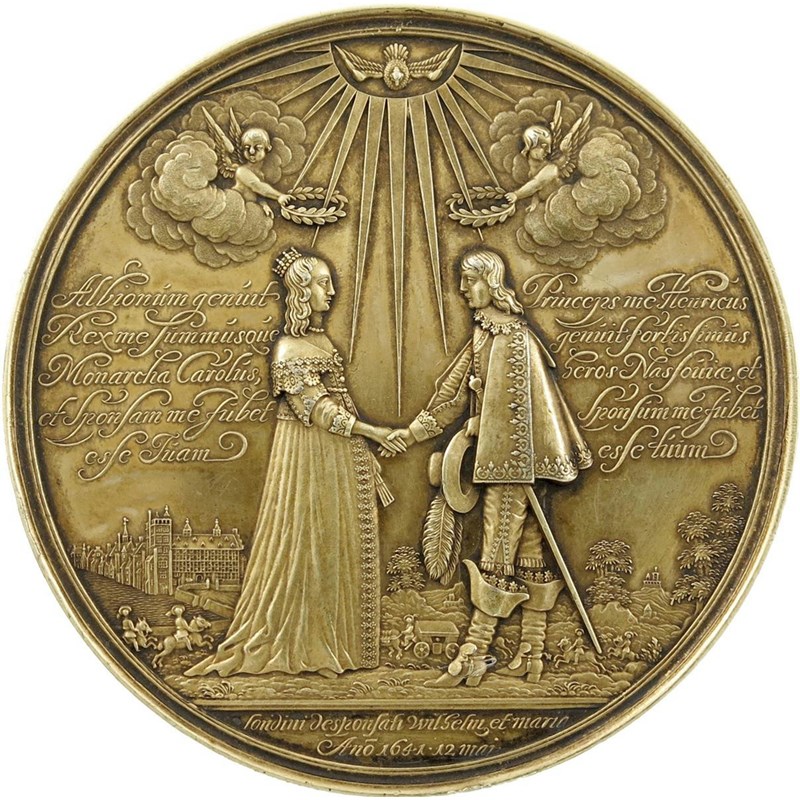 Mary, Princess Royal (1631-1660), marriage to Prince William II of Orange (1626-1650), German gilt-silver medal, 1641, by Johann Blum, the Prince and Princess joining hands below rays of light shining from heavenly dove between two cherubs, in the distance a palace, rev., William in the form of Pallas tramples on Bellona and receives an olive branch from Mary, 72mm (MI 287/100; Eim. 137; vL II, 251). An excellent example of a medal famous for its fine attention to detail, choice extremely fine.
