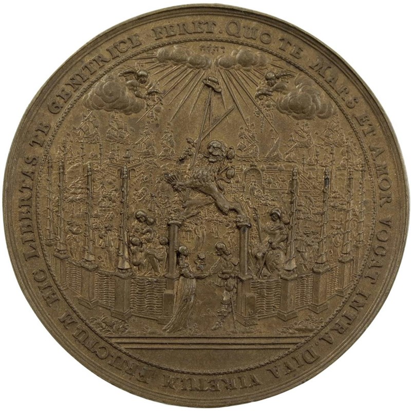 Mary, Princess Royal (1631-1660), her arrival in Holland, copper medal, 1642, by Sebastian Dadler, Frederick Henry, Prince of Orange, seated on throne, trophies and shields around, his foes at his feet, LIBERTAS PATRIÆ ME DEFENSORE TRIUMPHAT …, rev., Prince William and Princess Mary meet within a fenced garden with central Belgic lion, יְהֹוָה radiating from clouds above, QUO TE MARS ET AMOR…, 72mm (MI 290/105; vL II, 257; Eim. 138; Wiecek 107). Traces of having been gilt, nearly extremely fine.