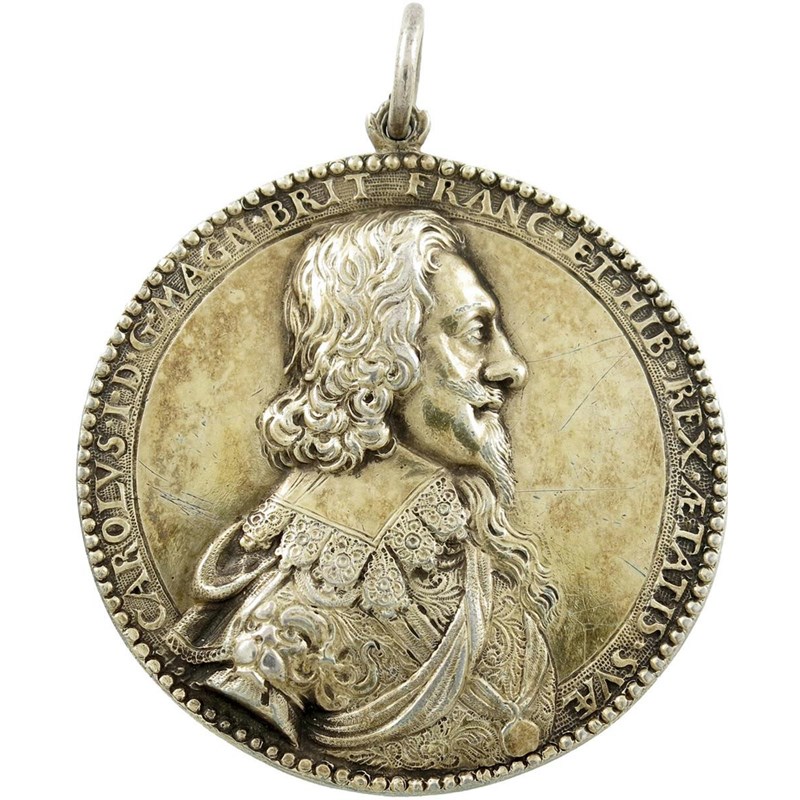 Charles I, gilt-silver portrait medallion, c.1642, in the style of Jean or Claude Warin, bust right wearing lace collar over armour, two sashes, one with Garter George, his hair long with lovelock over his left shoulder, CAROLVS I DG MAGN BRIT FRANC ET HIB REX ET ÆTATIS SVÆ, rev., Aurora in her chariot drawn by a winged horse, VIRTVTIS FORMÆQ PRÆVIA, 70mm, 90.44g (MI 292/107; Platt p. 241, type B), integral shaped suspension loop with ring. A handsome medal, good very fine and extremely rare.