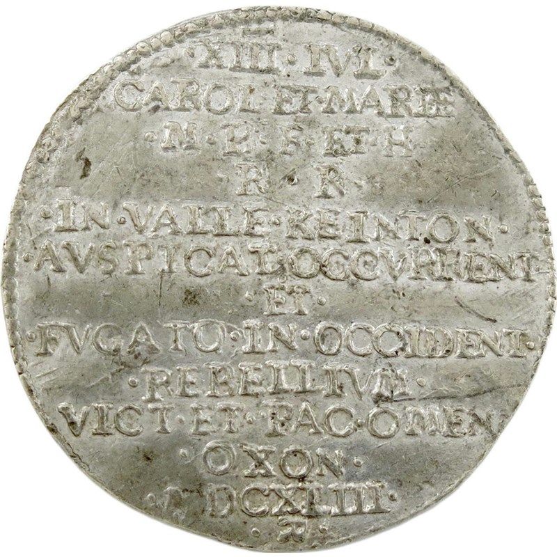 Charles I and Henrietta Maria, the final meeting at Kineton, Gloucestershire, pewter medal, 1643, by Thomas Rawlins, the King and Queen enthroned beneath sun and moon, a dragon slain beneath their feet, CERTIVS PYTHONEM INVICTI, rev., legend and date in twelve lines, XIII IVL / CAROL ET MARIÆ M B F ET H R R IN VALLE KEINTON AVSPICAT OCCVRRENT ET FVGATO IN OCCIDENT REBELLIVM VICT ET PAC OMEN OXON MDCXLIII, signed with horizontal "R" below, 36.5mm (MI 306/130; pl XXVI, 15; Platt p. 209, type A). Seemingly cast from a struck example, excessively rare.