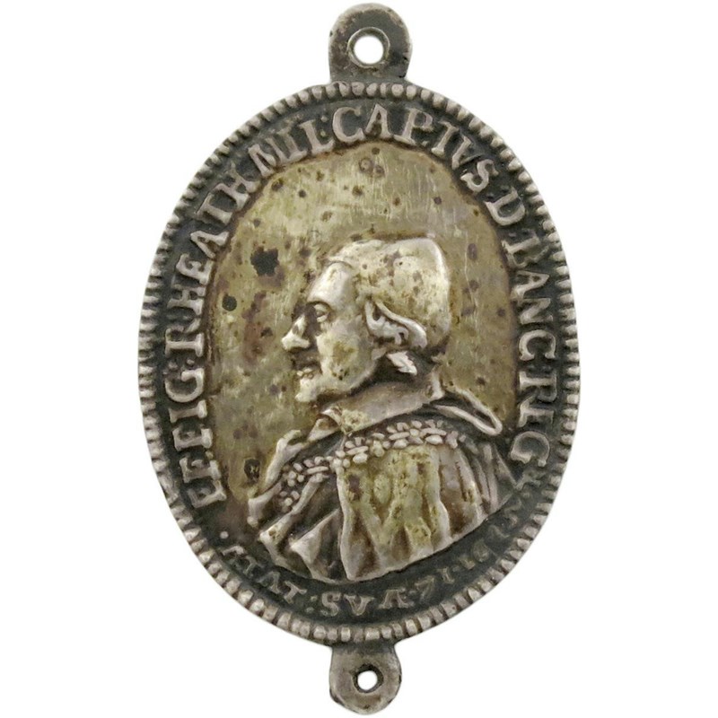 Sir Robert Heath (1575-1649), judge, politician, Attorney General and Lord Chief Justice, silver badge, 1645, by Thomas Rawlins, signed R on obverse, bust left in robes of office, Collar and wearing cap, EFFIG R HEATH MIL CAP IVS D BANC REG - ÆTAT SVÆ 71 1645, rev., armorial shield of Heath in incuse, within laurel branches, 40.5 x 25mm (MI 319/154; Platt II, pp. 150-51), integral suspension loop and loop also at bottom. Good very fine, seemingly once gilt and uneven tone, very rare.