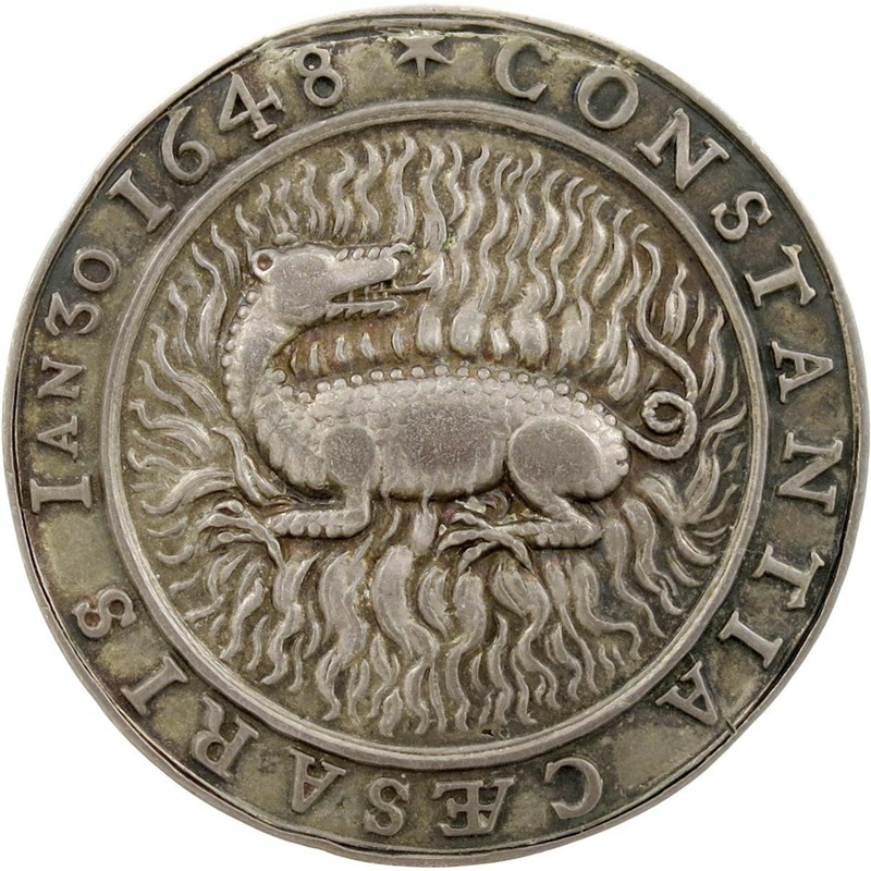 Charles I, Death and Memorial, cast silver medal, 1649, by Thomas Rawlins, bust left, hair long, in falling collar and decorated armour, two roses above, plain in field, SVCCESSOR VERVS VTRISQVE, rev., a salamander amid flames, CONSTANTIA CAESARIS IAN 30 1648, 42mm (MI 341/188; Eim. 157; Platt I, type B, pp. 244-45; Farquhar p. 270). Good very fine with deep tone, rare.