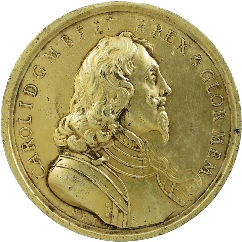 Charles I, gilt-bronze Memorial medal, 1649, struck after the Restoration, by Norbert Roettier, armoured bust right, hair long and love-lock over left shoulder, CAROL I DG M B F ET REX, signed NRF below truncation, rev., in 6 lines, REX PACIFICVS VICTVS VINCEBAT HOSTES VICTOR TRIVMPHAT IN COELIS, 59mm (MI 346/199; vL II, 320; Platt I, type A, p. 260). The gilding marked, but very fine and gilt examples very rare.