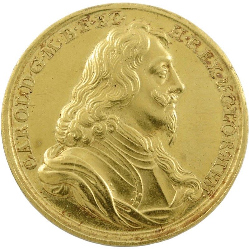 Charles I, gold Memorial medal, 1649, by James and Norbert Roettier, armored and draped bust right, CAROL DG M B F ET H REX & GLOR MEM, rev., hand from heaven holds crown over a pastoral landscape, VIRTVT EX ME FORTVNAM EX ALIJS, 34.5mm 16.7 mm (MI 347/201; Platt I, type C, p. 263; Eim. 162b). Extremely fine and excessively rare in gold.