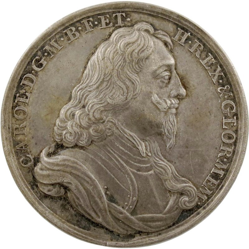 Charles I, silver Memorial medal, 1649, by James and Norbert Roettier, armored and draped bust right, CAROL DG M B F ET H REX & GLOR MEM, rev., hand from heaven holds crown over a pastoral landscape, VIRTVT EX ME FORTVNAM EX ALIJS, 34.5mm 16.7 mm (MI 347/201; Platt I, type C, p. 263; Eim. 162b). Extremely fine and toned.