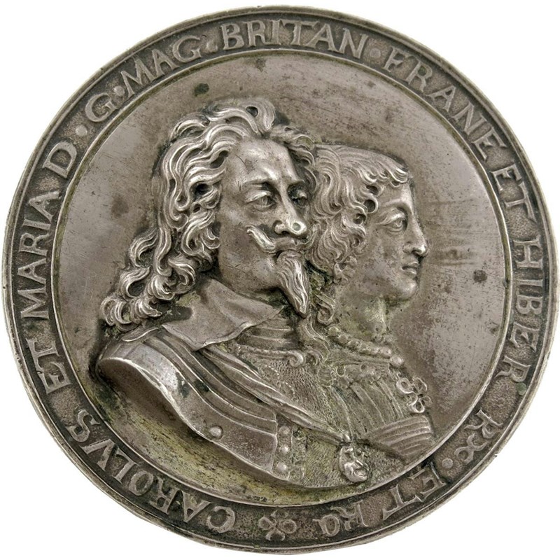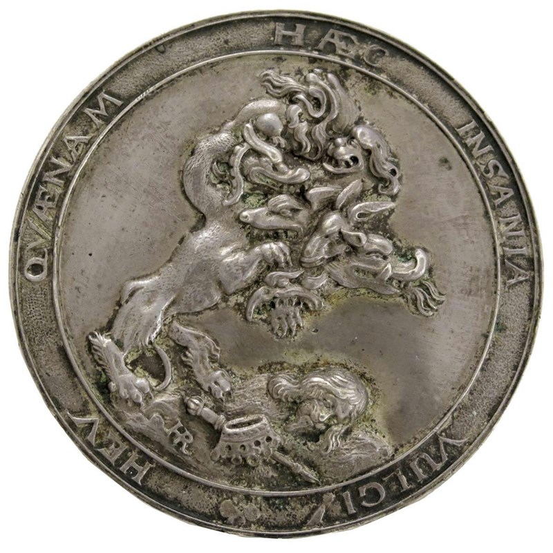Charles I, a German [Saxony] hollow silver Memorial medal, 1649, by Hans Reinhardt the younger, signed HR in monogram on reverse, conjoined busts right of Charles and Henrietta Maria, he, in armour slightly turned, hair falling over plain lace collar, wearing Garter George on ribbon, she with pearl necklace, CAROLVS ET MARIA DG MAG BRITAN FRANE ET HIBER Rx ET Ra, rev., a seven headed monster rampant over the head of Charles and the crown and scepter, HEV QVÆNAM HÆC INSANIAVULGI