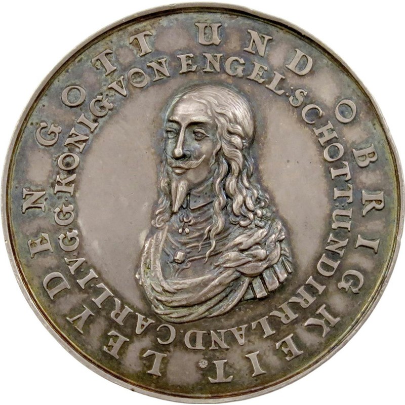 Charles I, silver Memorial medal, 1649, of German or Dutch manufacture, signed F, armoured and draped bust three-quarters left, hair long, lion shoulder-plate, legend in two lines around, F LEYDEN GOTT UND OBRIGKEIT - CARL I V G G KÖNIG VON ENGEL SCHOTT UND IRRLAND, rev., a seven-headed monster rampant over the decapitated head of Charles, the crown and sceptre beside it, BEY DES POFELS MACH TUND STREIT, 46mm (MI 352/210; Eim. 163; Platt I, p. 257; vL II, 321). Choice extremely fine with light tone.