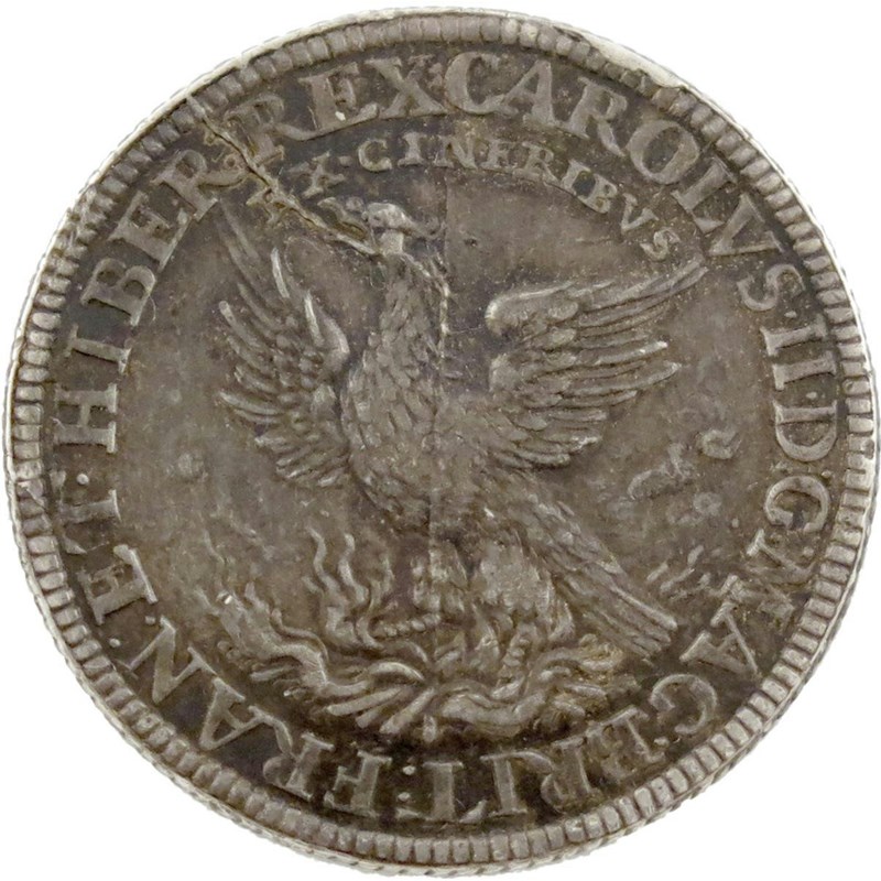 Platt writes, "An excessively rare medal, known only in silver". MI lists two specimens, one in the Hunterian Collection, the other in the Bavarian Royal Collection, Munich [now housed in the Münchner Residenz]. The British Museum subsequently acquired their specimen in 1899 and it appears in the Plates to MI. The medal is hard to date, old obverse die medal displays a slight central die flaw from the top to bottom and another, more marked, extending from the beak of the phoenix to the edge (between HIBER and REX). The reverse is in a somewhat differing style and no other medals of the period have a milled edge. The dies may have broken, this would explain its rarity, but the theme of the medal with the name of Charles II linked with the image of a phoenix would not have been popular in Cromwellian England. Thomas Rawlins was believed to have moved to France by 1648 and although he returned to England in 1652 he was no reinstated as Chief Engraver at the Mint till after the Restoration in 1660.
