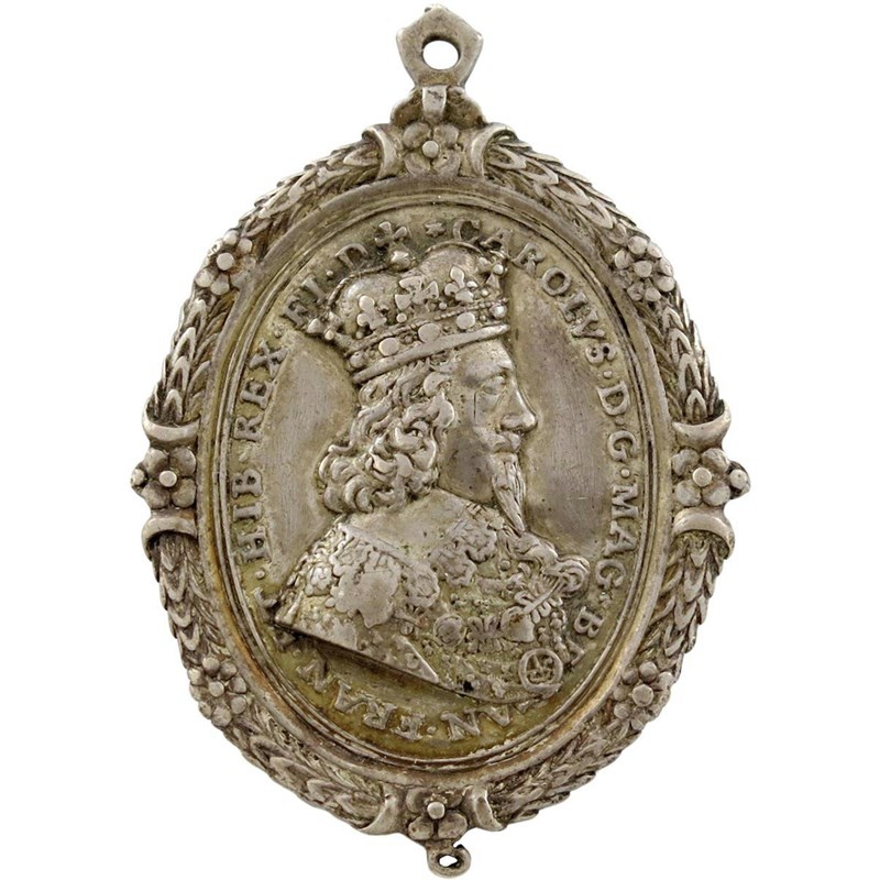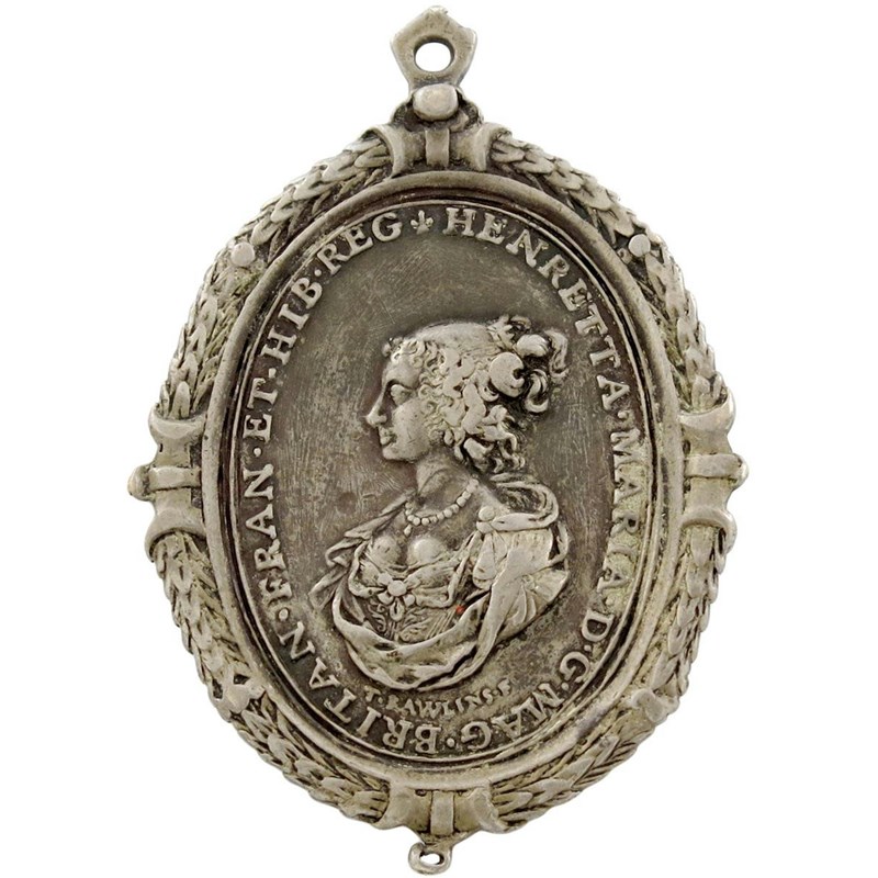 Charles I, gilt-silver Royalist Badge, by Thomas Rawlins, crowned bust of Charles I right with falling lace collar, wearing Garter Collar and George, CAROLVS DG MAG BRITAN FRAN ET HIB REX FI D, rev., bust of Henrietta Maria left, her hair tied back, decorative dress tied with bow, pearl necklace with drop, signed T RAWLINS F below, HENRETTA MARIA DG MAG BRITAN FRAN ET HIB REG, wreath border around to both sides, 57 x 40mm (MI 354/216; pl. XXXI,6; Eim. 166; Platt I, type A, p. 186-87), integral suspension loop and small loop at bottom (to take pearl drop). Very fine.