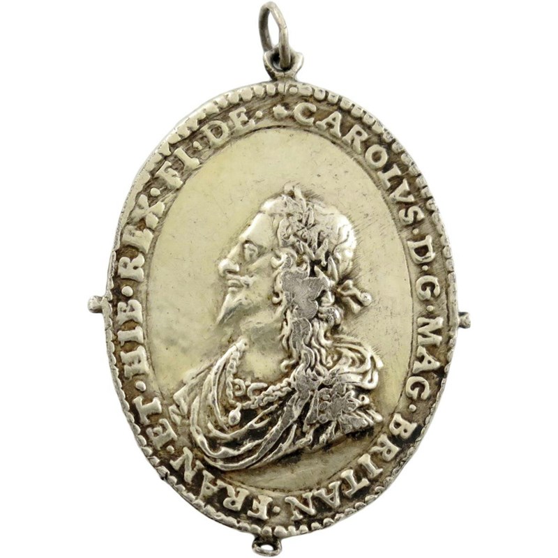 The Rawlins portrait of the King on this badge is found on others (see previous lot), sometimes with and sometimes without a border, but it is not recorded in this larger sized and with a legend.