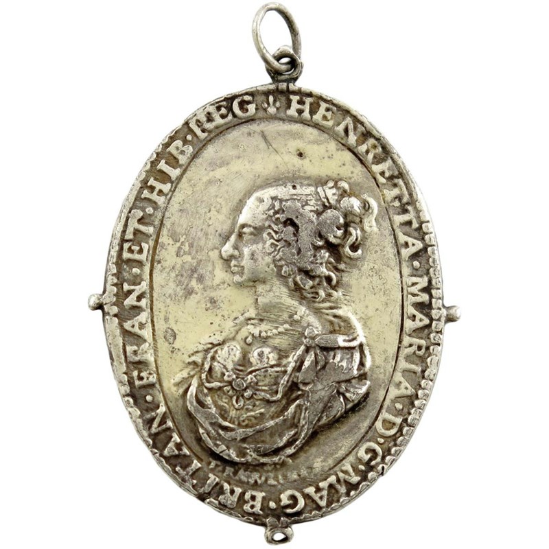 Charles I and Henrietta Maria, gilt-silver Royalist Badge, by Thomas Rawlins, laureate and armoured bust of Charles left, with lion shoulder-plate and Garter George on chain, CAROLVS DG MAG BRITAN FRAN ET HIB REX FI DE, rev., bust of Henrietta left, her hair tied back and curled at sides, wearing pearl necklace, signed below, HENRETTA MARIA DG MAG BRITAN FRAN ET HIB REG, 42 x 31mm (cf MI 355/218 for obverse; MI 354/216 for reverse), integral suspension loop and ring. Very fine, lightly chased the gilding light and contemporary and a seemingly unpublished variety.