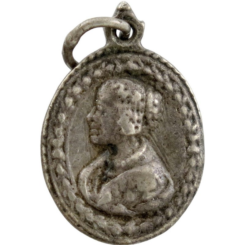 Charles I and Henrietta Maria, small silver Royalist Badge, bare-headed bust of Charles left, with long hair with love lock on left shoulder, wearing falling lace collar, rev., bust of Henrietta Maria left, hair tied in knot behind and wearing necklace with pendant, leaf border to both sides, 22.5 x 14mm (MI 358/225; Platt I, type D, p. 287), integral loop for suspension and ring. Very fine, scarce.