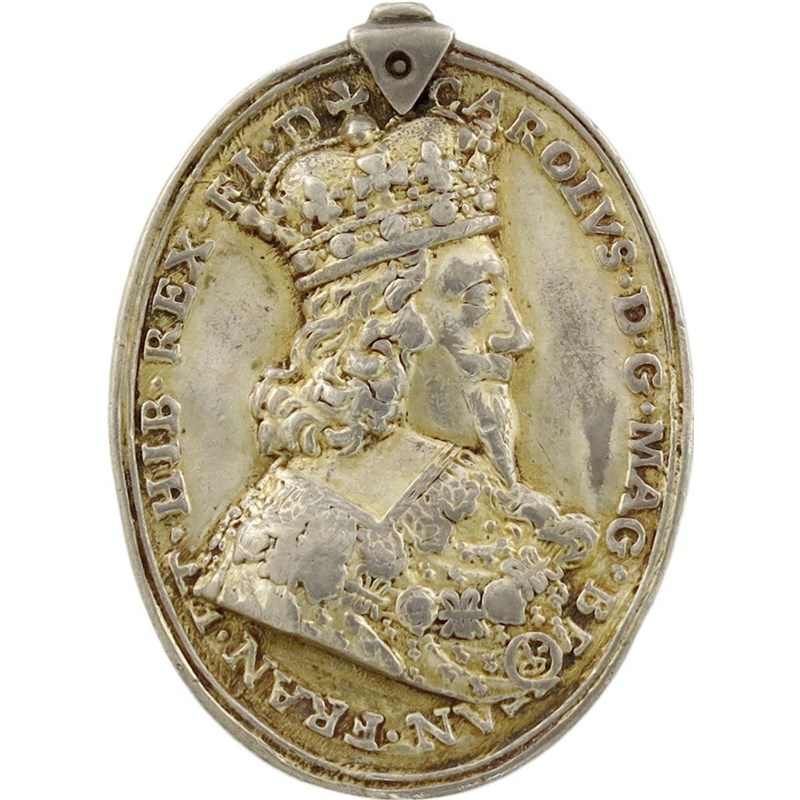 Charles I, gilt-silver Royalist Badge, by Thomas Rawlins, crowned bust of Charles I right with falling lace collar, wearing Garter Collar and George, CAROLVS DG MAG BRITAN FRAN ET HIB REX FI D, rev., large crown over shield of Royal arms within Garter, plain rim, 39.5 x 29mm (MI 360/232; Eim. 168; Platt I, pp. 160-61), a broken, but contemporary suspension loop replaces the original. The gilding part-worn, very fine and very rare.