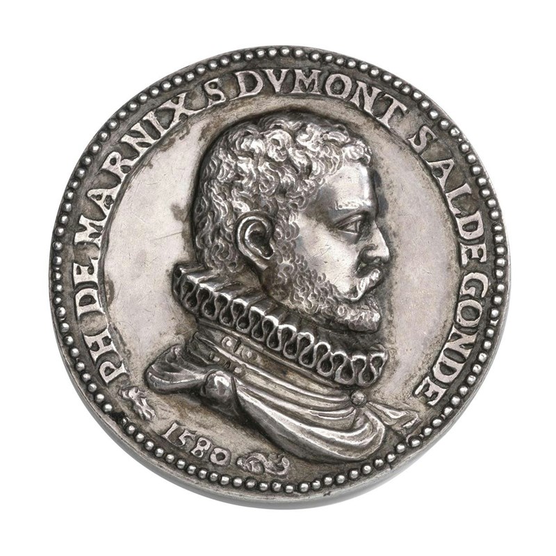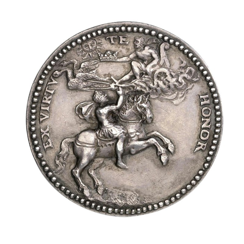 Philips van Marnix, Lord of Saint-Aldegonde, Lord of West-Souburg (1540-1598), Flemish statesman, cast Dutch silver medal, 1580, unsigned, cast and chased, armoured bust right, wearing ruff collar, PH DE MARNIX S DVMONT S ALDEGONDE, rev., Venus, her car drawn by swans, offers crown to warrior on rearing horse, EX VIRTV TE HONOR, 37mm (MI 131/84; vL I, 280; Smolderen p. 267, pl. LXVII, fig 8). A handsome medal, extremely fine and extremely rare.