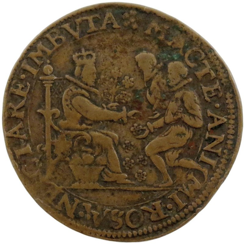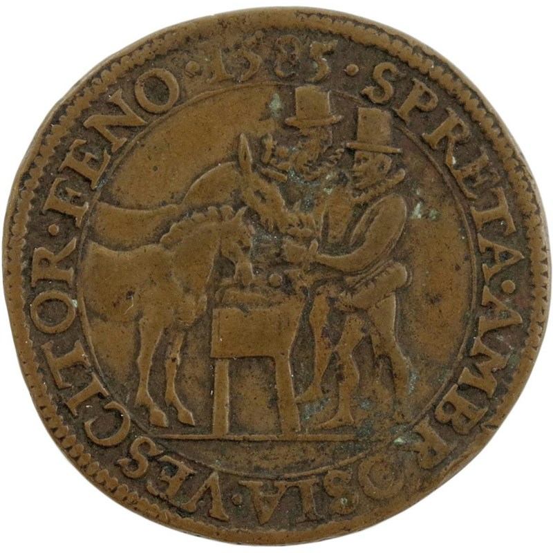 Assistance to the United Provinces, Dutch copper Jeton, 1585, Elizabeth enthroned, presents roses to two Deputies, MACTE ANIMI ROSA NECTARE IMBVTA, rev., two Spaniards eat hay from a manger along with a horse and donkey, SPRETE AMBROSIA VESCITOR FENO, 29.5mm (MI 133/86; Eim. 51; Dugn 3044; vL I, 355, 2). Very fine.