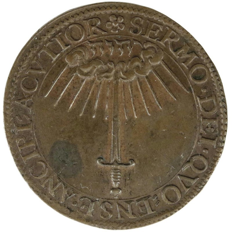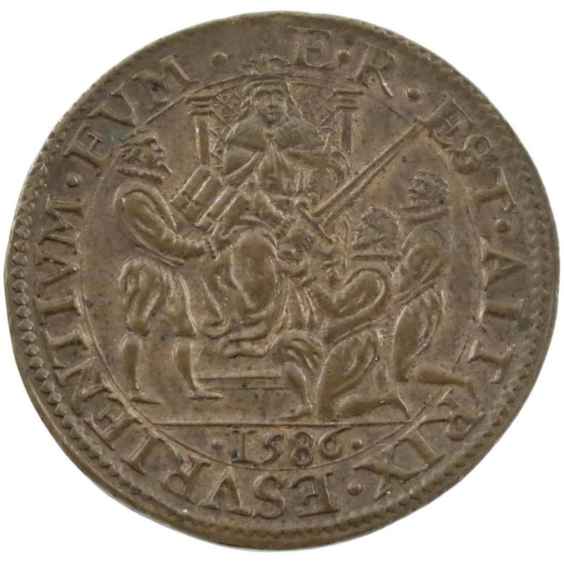 Elizabeth I, Assistance to the United Provinces, Dutch copper jeton, 1586, Elizabeth enthroned presents sword to two Deputies, the Earl of Leicester stands to left, E R EST ALTRIX ESVRIENTIVM, rev., a sword, its tip in clouds from which יְהֹוָה radiates, SERMO DEI QVO ENSE ANCIPI ACVTIOR, 30mm (MI 133/87; vL I, 359; Dugn 3096). Good very fine and Elizabeth well defined.
