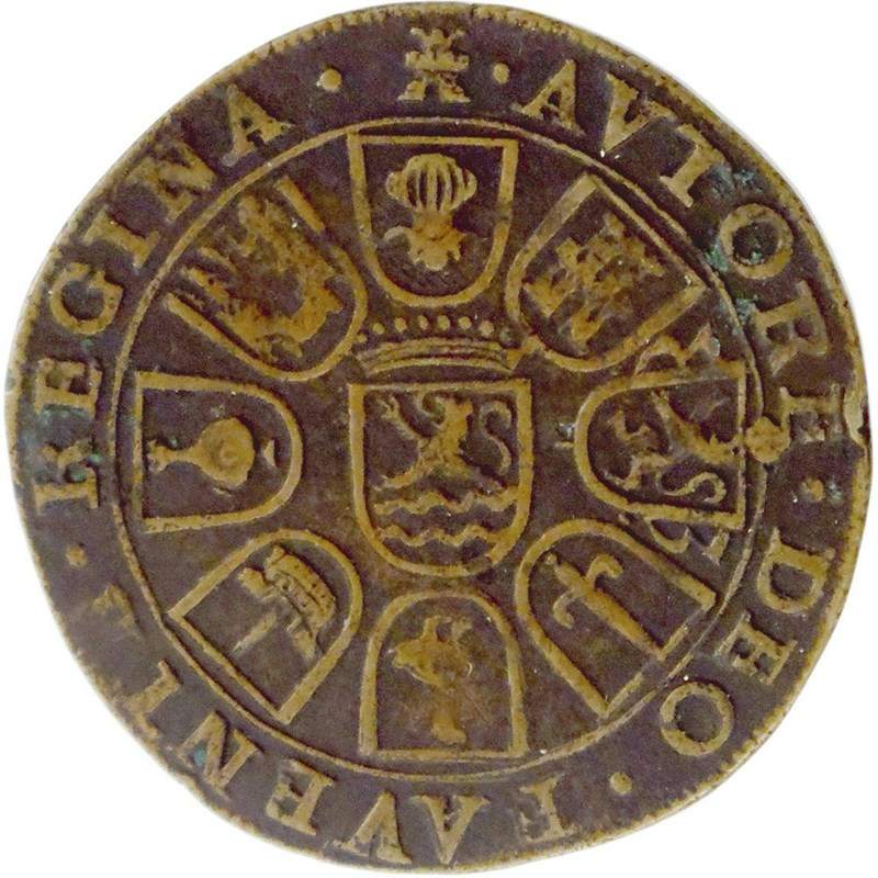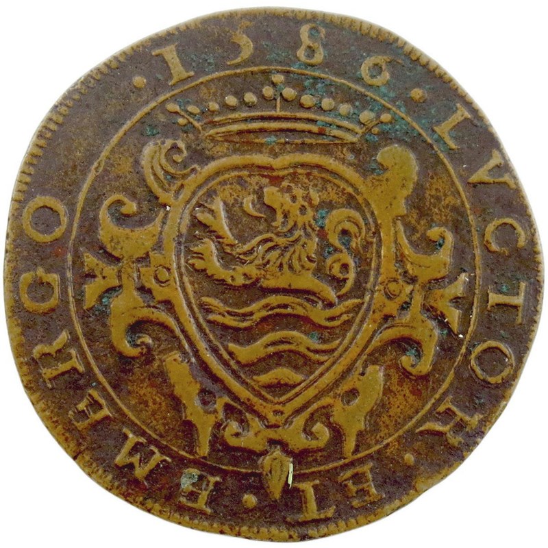 Bergen-op-Zoon protected and the alliance with England, Dutch copper jeton, 1586, struck at Middelbourg, shield of Zeeland, LVCTOR ET EMERGO, rev., shields of eight towns around central shield of Zeeland, AVTORE DEO FAVENTE REGINA, 31mm (MI 136/92; Dugn. 3093; vL I, 356). Very fine.