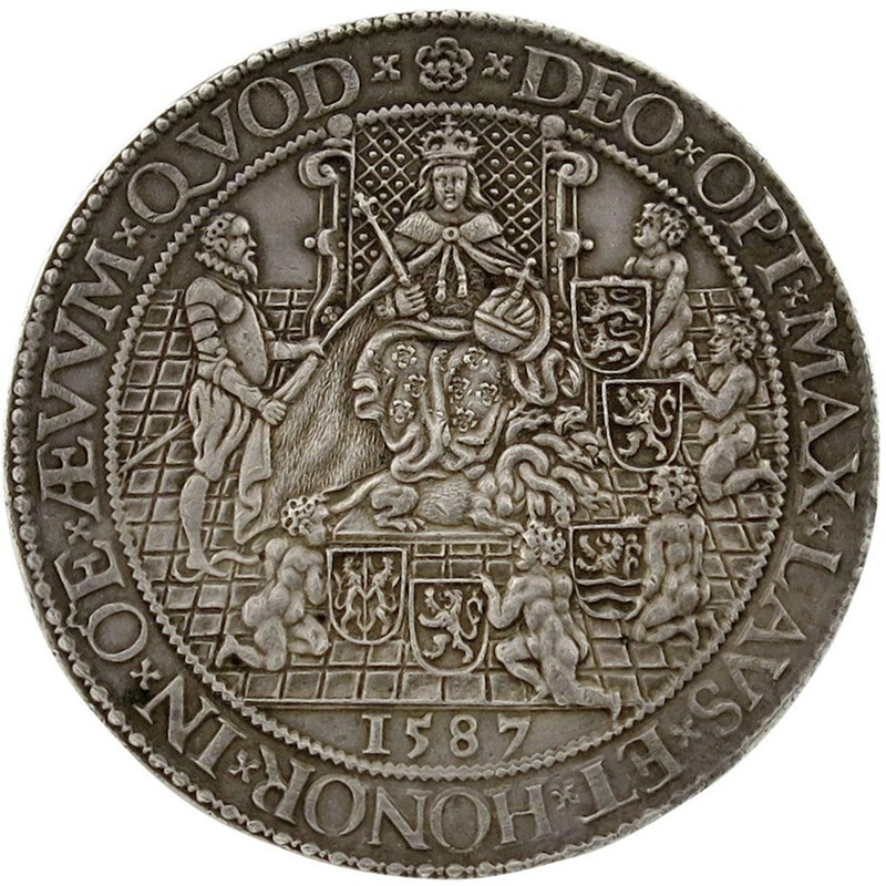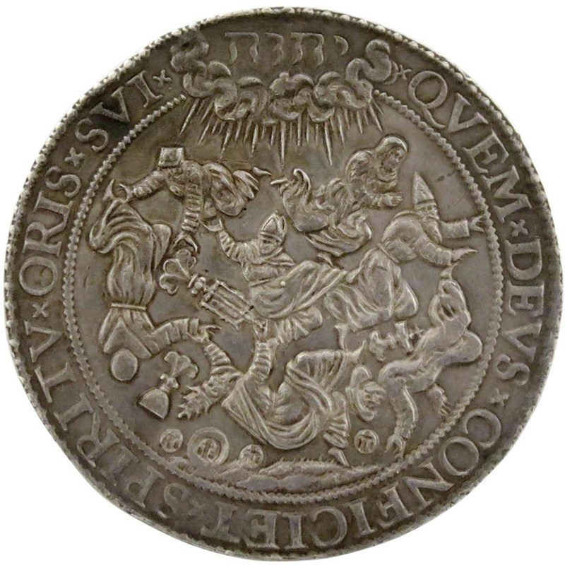 The Protestants supported in the United Provinces, heavy silver medal, 1587, by Gerhard van Bijlaer, struck in Dordrecht, the Queen, her feet trampling a hydra, attended by courtier, perhaps the Earl of Leicester, five naked infants kneel with armorial shields, DEO OPT LAVS ET HONOR IN OE ÆVVM QVOD, rev., the name יְהֹוָה radiates on the Pope, bishops and other religious figures and objects falling from the clouds, QVEM DEVS CONFICIET SPIRITV ORIS SVI, 51mm; 60.94g (MI 139/99; Eim. 53; vL I, 369). Good very fine, slight edge bruise to reverse at 10 o'clock.