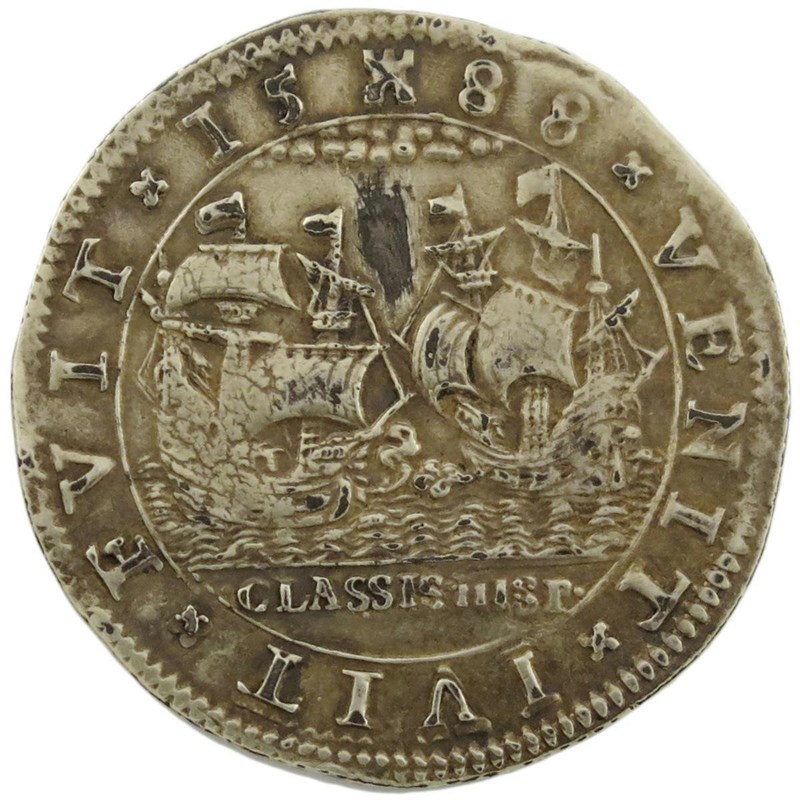 The defeat of the Spanish Armada, Dutch silver jeton, 1588, struck in Middelbourg, arms of Zeeland, crowned and garnished, SOLI DEO GLORIA, rev., two ships in action firing cannon and muskets, VENIT IVIT FVIT - CLASSIS HISP, 33mm (MI 146/113; Eim. 58; vL I, 384, 2; Dugn. 3186; MH 6). Some flatness in striking, a mark between ships where old gilding scratched away, very fine and rare.