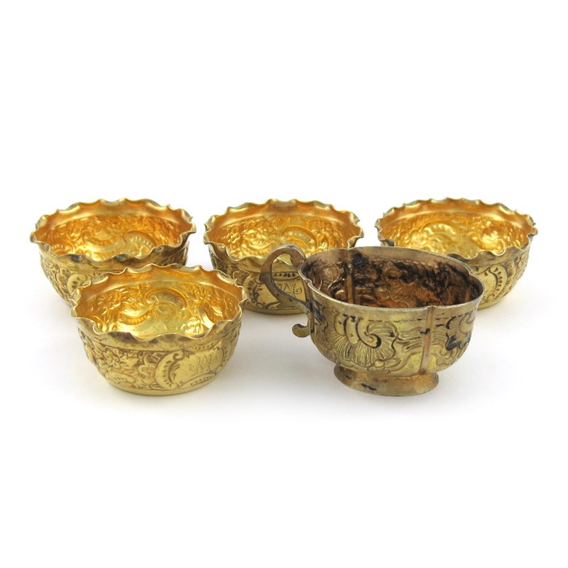 lobed oval form, chased shell decoration, scroll handle, on a raised oval foot, length 7cm, plus a set of four Victorian silver-gilt salt cellars, Birmingham 1892, approx. weight 4.3oz. (5)