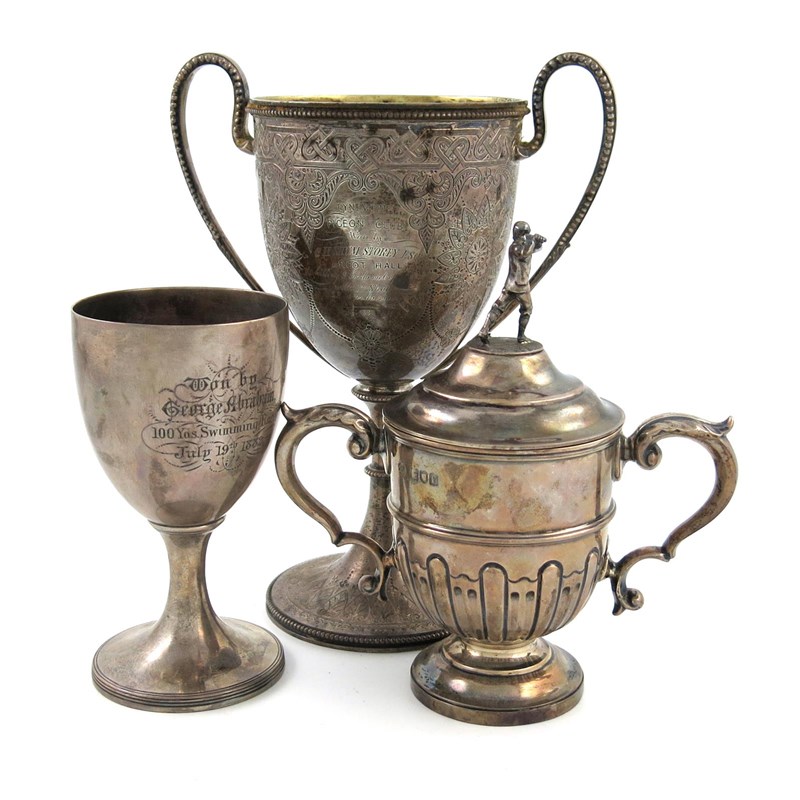 comprising: a Victorian two-handled cup, by The Barnards, London 1868, urn form, engraved decoration, with a presentation inscription relating to Tynemouth Pigeon Club, plus an Edwardian trophy cup, by William Hutton and Sons, London 1901, with a golfer finial, and a trophy goblet, by Peter and William Bateman, London 1809, with a later inscription, approx. total weight 30oz. (3)