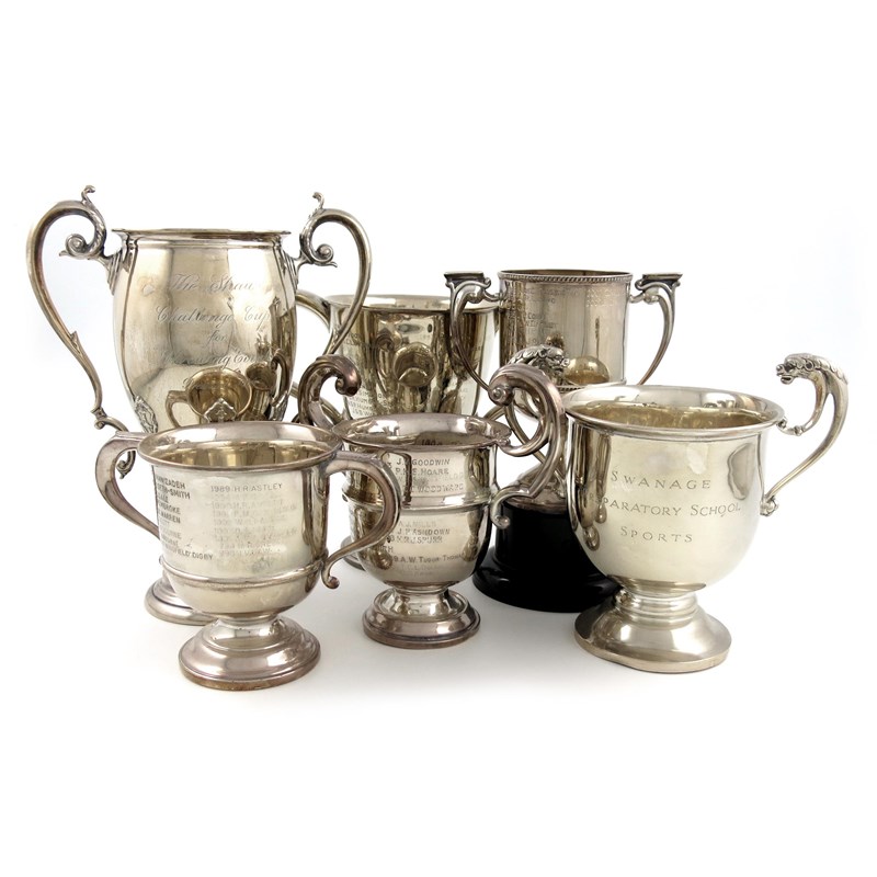 comprising one with cut card decoration, by S. Blanckensee and Sons, Birmingham 2929, with presentation inscriptions, plus four various others, all inscribed and an electroplated two-handled trophy cup, approx. weighable 55oz. (6)