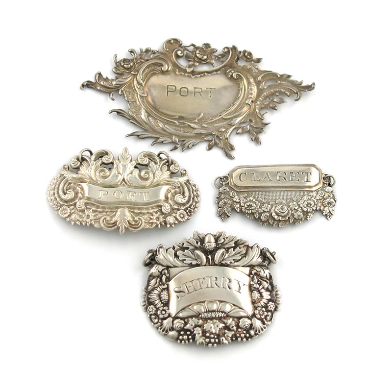 comprising: one of pierced foliate scroll form, with import marks for 1896, incised 'PORT', plus others 'CLARET', 'SHERRY' and 'PORT', approx. weight 2oz. (4)