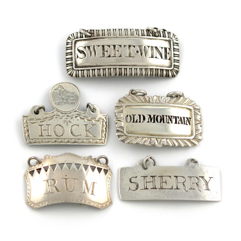 A collection of five antique silver wine labels
