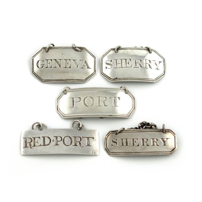 broad rectangular form, canted corners, reeded borders, incised 'RED PORT', 'GENEVA', 'PORT', 'SHERRY' (x2), approx. weight 1.1oz. (5)