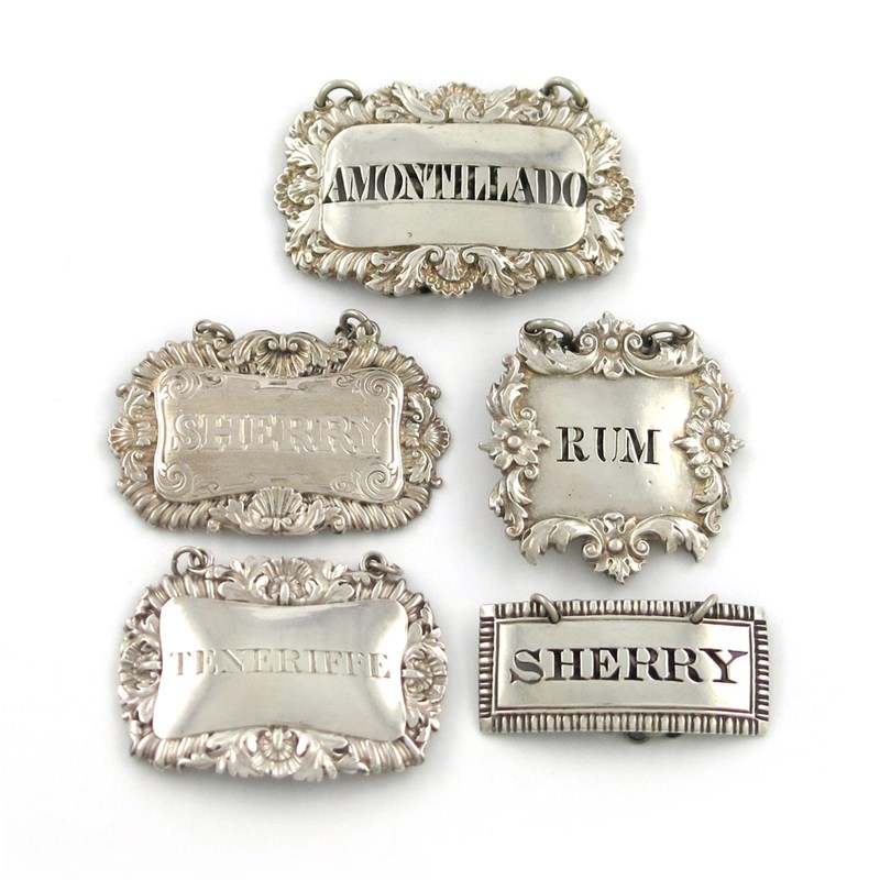 broad rectangular form, shell and gadroon and foliate borders, 'AMONTILLADO', 'TENERIFFE', 'SHERRY' (x2), and 'RUM', approx. weight 3.3oz. (5)