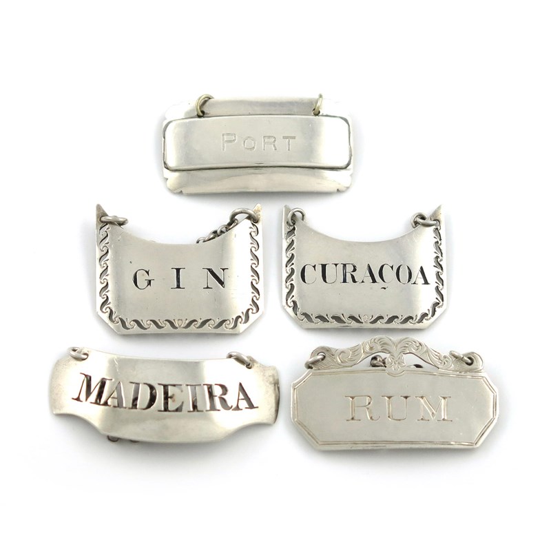 comprising: a Victorian pair with a pierced border and blackened 'CURACOA' and 'GIN', by William Summers, London 1871, plus two incised 'RUM' and 'PORT' and one pierced 'MADEIRA', approx. weight 1.8oz. (5)