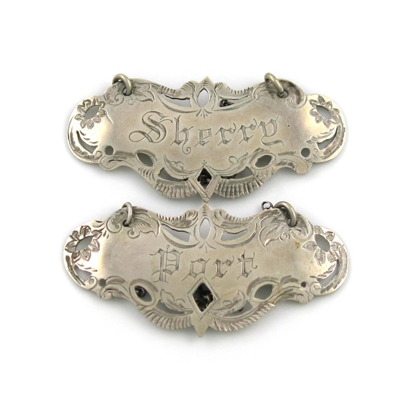 shaped oval form, pierced and engraved decoration, incised 'PORT' and 'SHERRY', approx. weight 0.4oz. (2)