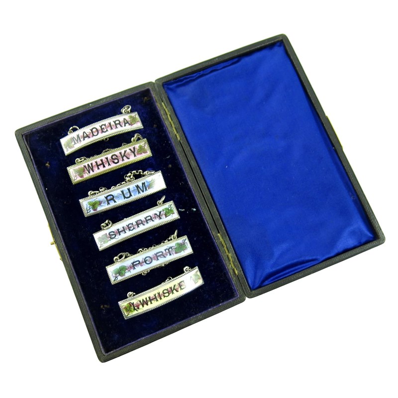 narrow rectangular form, beaded borders, the centres enamelled 'WHISKEY', 'SHERRY', 'PORT', 'RUM', 'MADEIRA' and 'WHISKY', in a case. (6)
