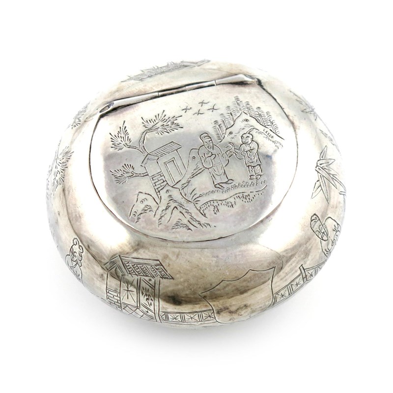 circular form, the hinged cover and sides with oriental figures in landscape settings, diameter 7.8cm, approx. weight 2.2oz.